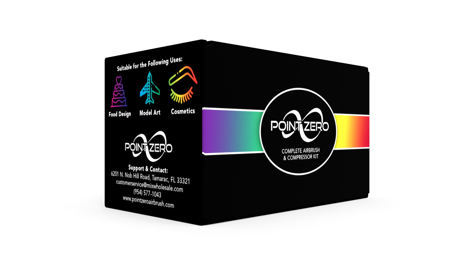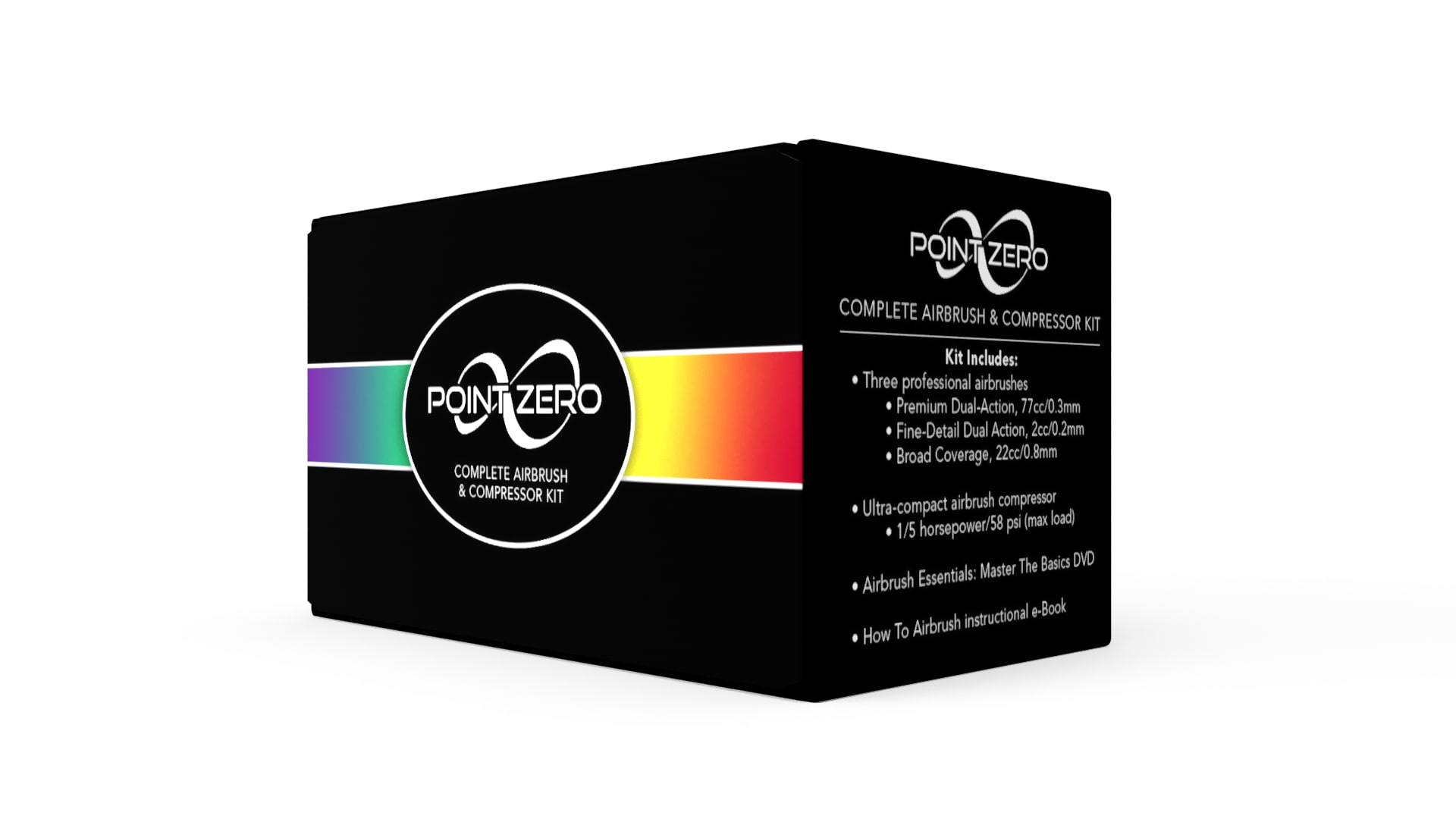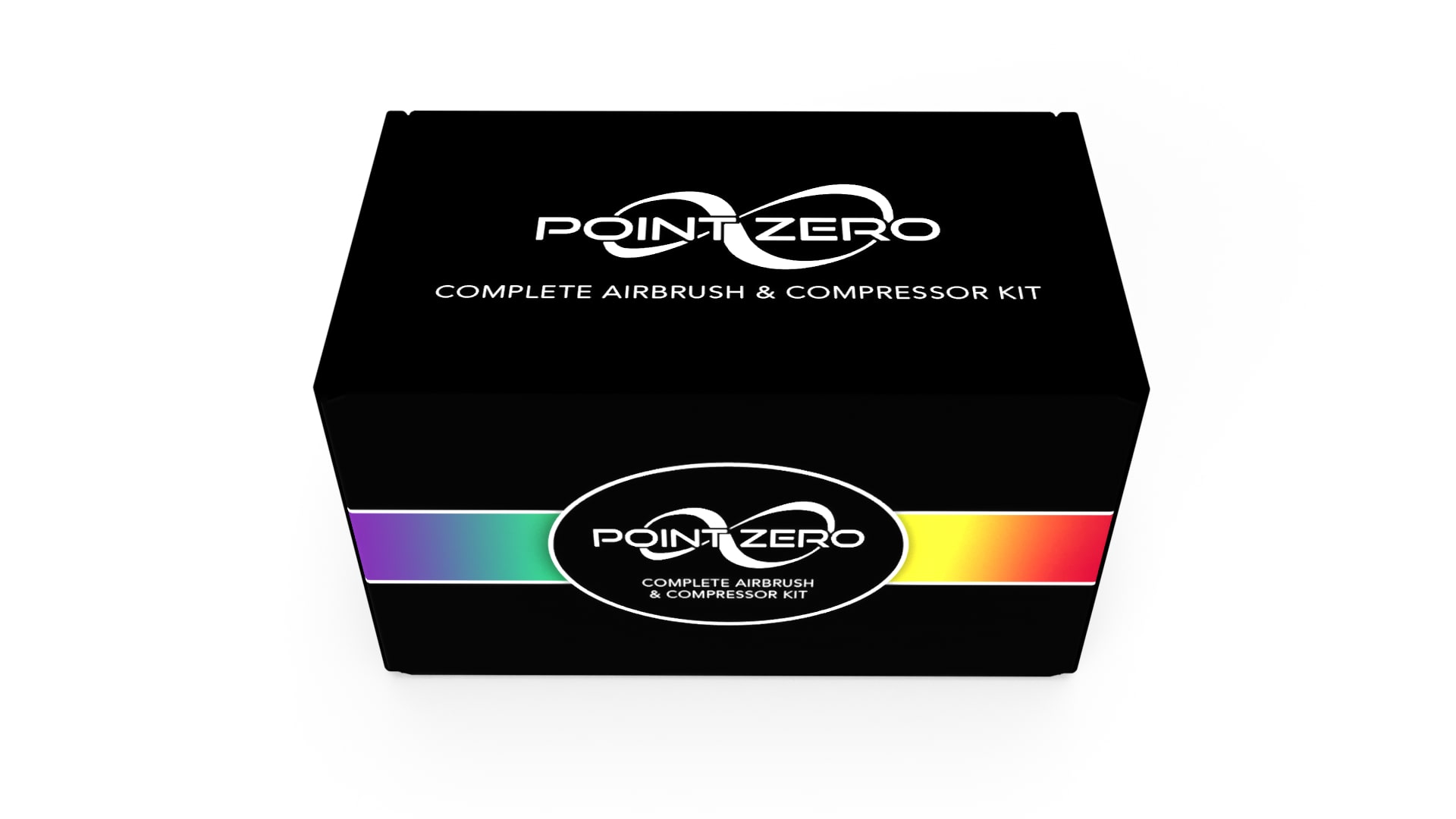 This conceptual redesign for the PointZero complete airbrush and compressor kit features sleek, black packaging with a bold and colorful spectrum that adds a pop of excitement. The design presents a modern, minimalist aesthetic that is sure to appeal to a wide range of customers. While this product is only a concept, it is a testament to creating striking and innovative designs that make a lasting impact.